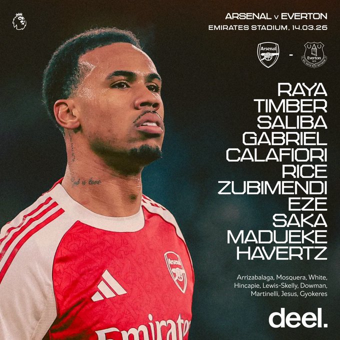 - Confirmed Arsenal team v Everton – Madueke and Saka starton March 14, 2026